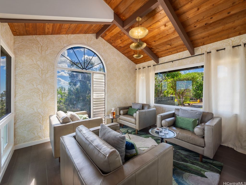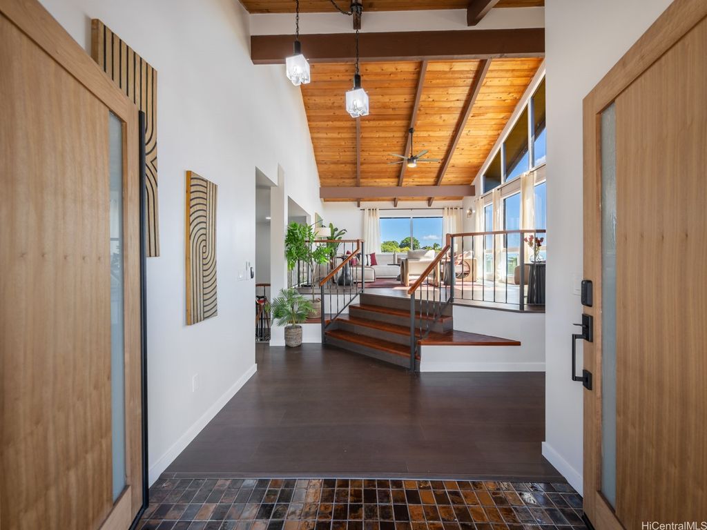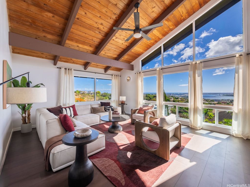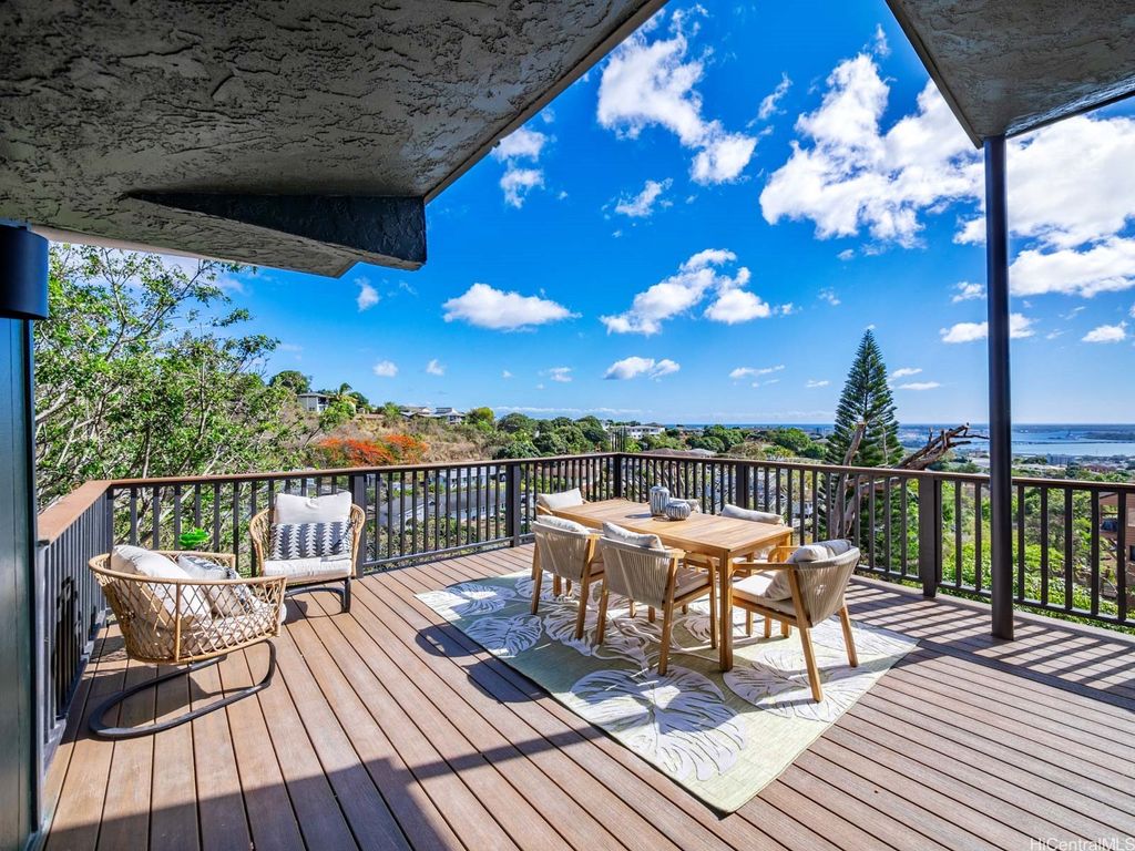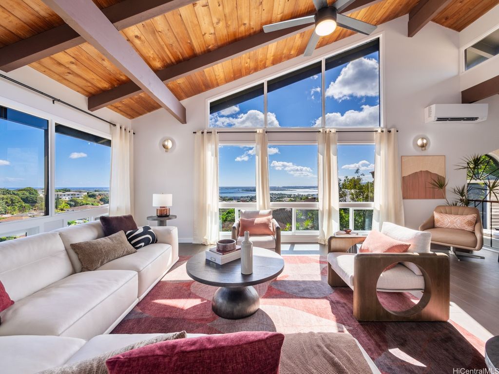 Welcome to this unparalleled residence that rivals the most prestigious neighborhoods and redefines luxury living in Aiea Heights. This exceptional home has been fully + meticulously renovated and boasts expansive ocean views, 5 spacious bedrooms, 3.5 bathrooms and sits on an oversized 20,711 sf lot. With beautiful high ceilings and steel-frame construction, this home offers unique mid-century modern architecture that flows seamlessly throughout the indoor and outdoor spaces. The primary bedroom suite on the main floor is a haven of tranquility, complete with a large, luxurious en suite bathroom that promises a spa-like experience every day. Designed for both relaxation and entertainment, this home features a wrap-around deck, sophisticated cigar + whiskey lounge, an indoor sauna, and a rumpus room with a wet bar"”perfect for hosting guests or unwinding in style. Located on a highly desirable street with underground utilities and great curb appeal. This property also holds potential for future development on the lower part of the lot, extending down to the street below, offering possible investment opportunities.