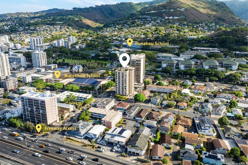The Alexander sits at the corner of Dole and Alexander Streets - just minutes from Maryknoll, Punahou, UH Manoa, and Kapiolani Hospital, with quick freeway access to Downtown and beyond. This rarely available corner end-unit provides added privacy and abundant natural light throughout. Enjoy sweeping views of Diamond Head and the city skyline from your home. Parking is conveniently located right next to the building entrance, and the unbeatable central location makes commuting in every direction simple and convenient.