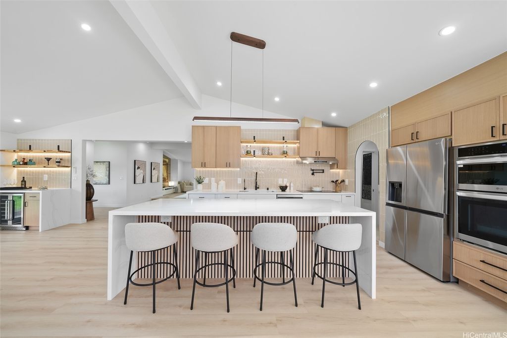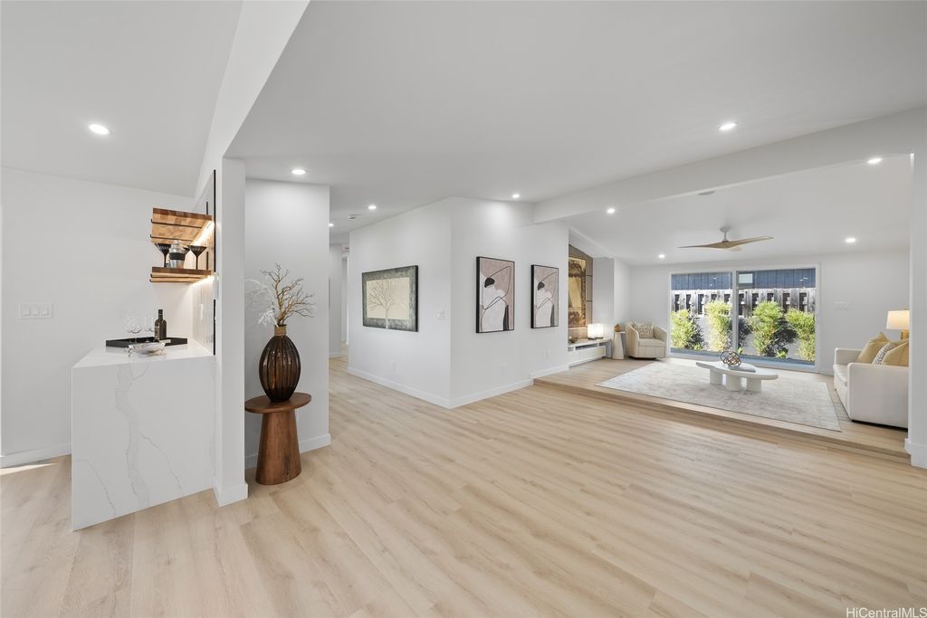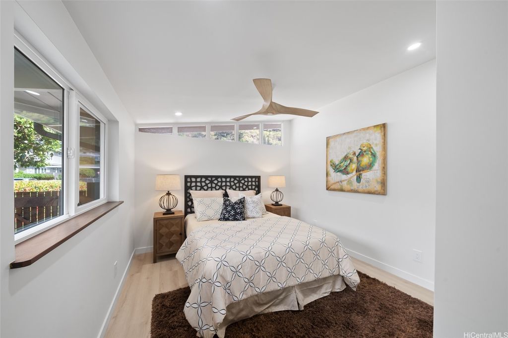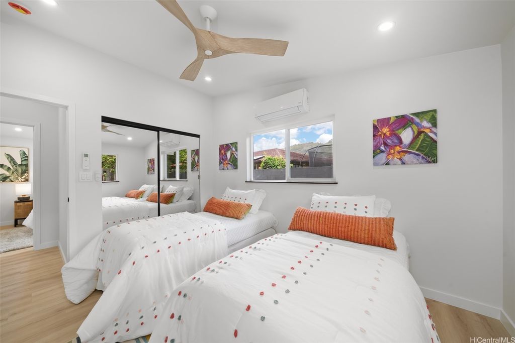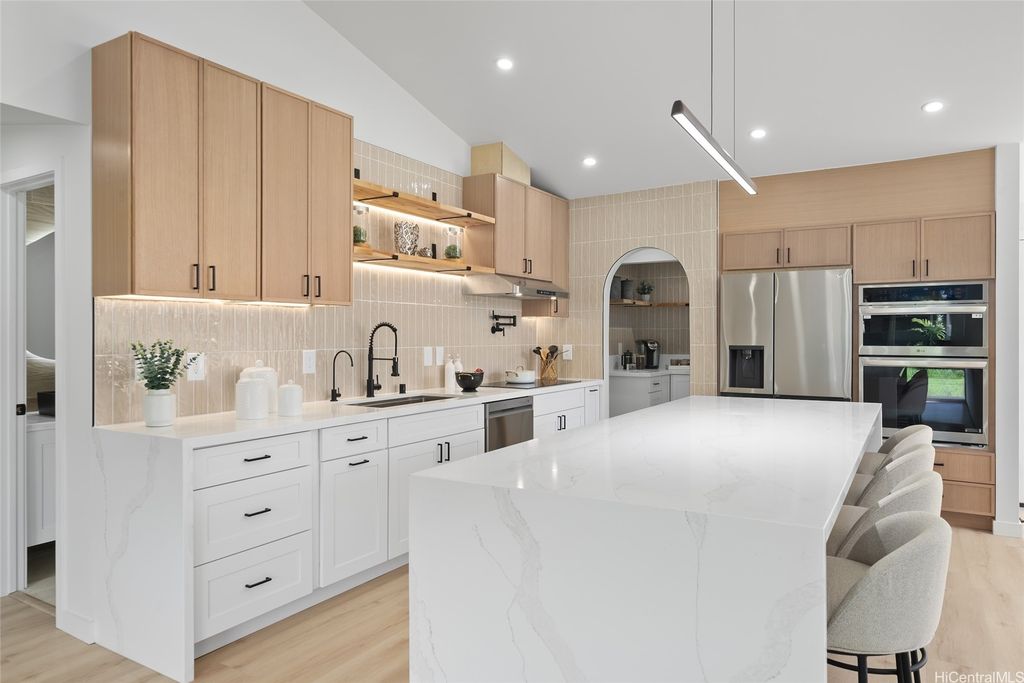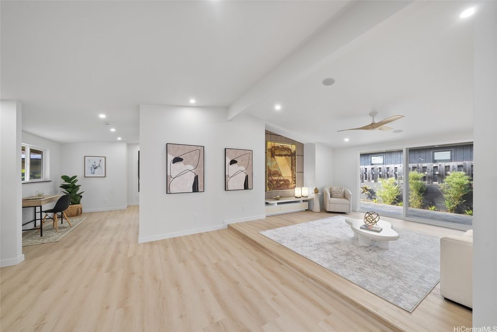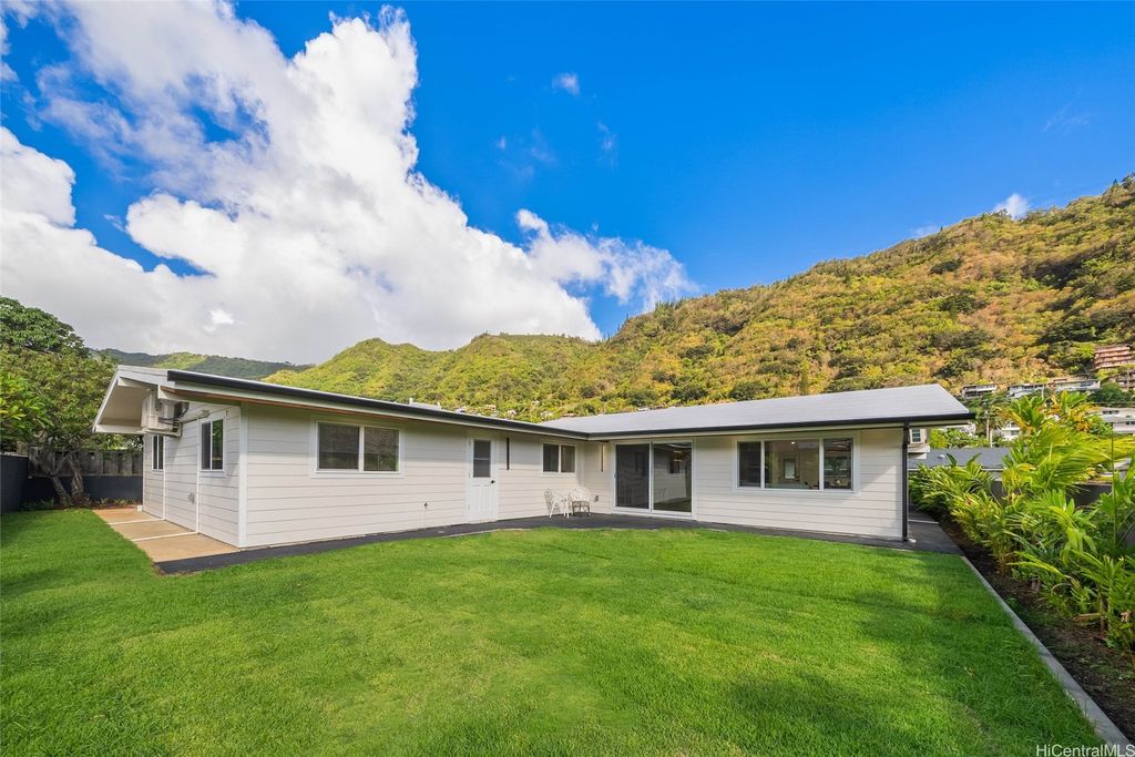 Impeccably remodeled single-level home on a large, level lot in highly desirable Manoa, known for its lush valley views, cooler breezes, and convenient access to top schools, parks, cafés, and shopping. A true open-concept layout with two spacious living areas creates a seamless flow. Built-in wall speakers fill the home with rich sound, while four energy-efficient split A/C units keep each room cool and comfortable. The stunning primary suite offers a peaceful retreat with a beautifully designed bedroom, expansive walk-in closet, and spa-inspired bathroom. Additional bedrooms are bright and inviting, complemented by all-new bathrooms throughout. The sleek modern kitchen connects effortlessly to the living and dining spaces, perfect for gatherings and everyday life. A large laundry room adds convenience and storage. Outdoors, the flat, oversized yard provides space to play, entertain, or create your dream outdoor living area. Every detail has been thoughtfully upgraded with quality finishes; move-in ready home combining luxury, and family comfort.