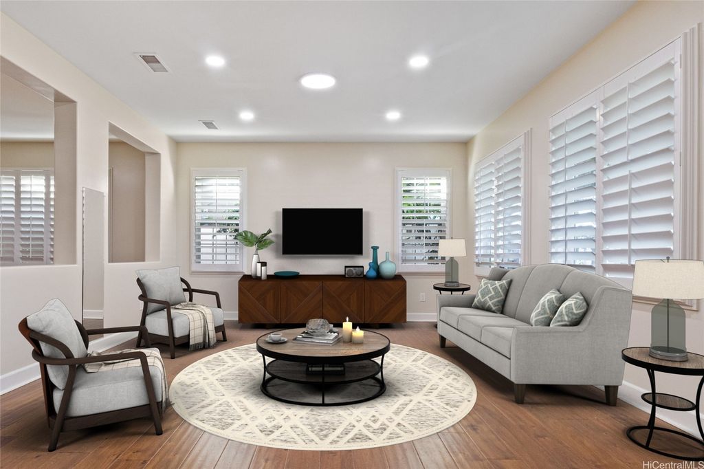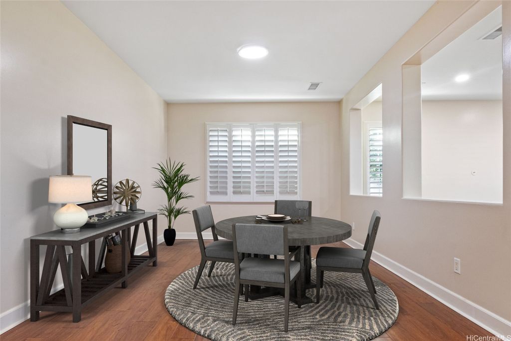This beautifully built Model 60.40 home in Kuapapa at Hoakalei features 5 spacious BR & 4.5 BA, with stunning views of the golf course. Equipped with 39 OWNED PV panels, this home is both elegant & energy efficient. As you enter, you'll be greeted by soaring ceilings, a striking chandelier, & grand sweeping staircase. The home is filled with natural light, thanks to numerous windows adorned w/ plantation shutters throughout. The gourmet kitchen offers granite countertops, high-end SS appliances, & ample cabinetry for storage. The primary suite includes an additional room upon entry & a private walkway leading to a large second-story lanai with great golf course views. One-bedroom, full BA and a half BA are conveniently located on the main floor. The main level features beautiful, engineered hardwood floors, while the second floor is equipped w/ laminate flooring. The home also includes a 2-car garage, a single garage, & additional driveway space for parking. The HOA fees cover cable/internet, with access to community swimming pool/hot tub & Wai Kai Hale Club. Just minutes away from shopping, dining, schools, beaches, & the Wai Kai waterfront area w/ its unique attractions.