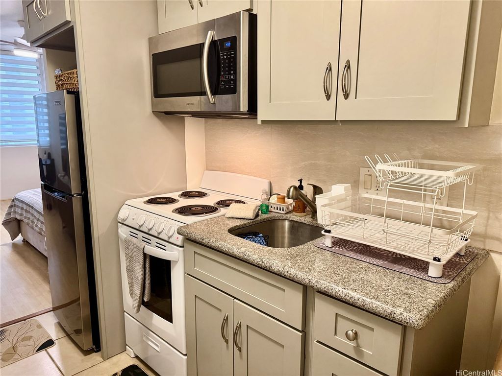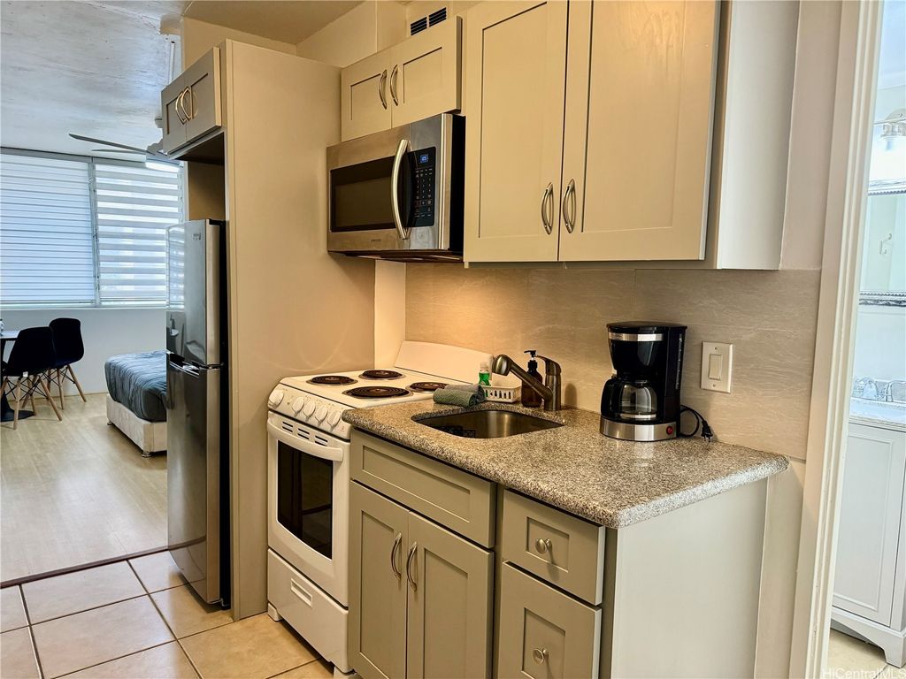 Ainahau Gardens - All Utilities Included!! Minimum 30-day stay. Contact Lee Ohlson at 808-341-6848. Centrally located in Waikiki, this fully furnished studio apartment is ready for you to move in, just bring your suitcase. A must-see to truly appreciate! Features full-sized kitchen (stove, oven, microwave) with pantry closets, window A/C, and a secure building. Situated in the heart of Waikiki, it is a short walk to the iconic Waikiki Beach, shopping centers, restaurants, bus stops, and vibrant entertainment options. This prime location in Waikiki offers a low-rise building with a secure elevator (FOB access), a security system, and coin-operated laundry facilities on each floor. The property provides bike, moped, and surfboard storage. Utilities included are electricity (capped at $75, internet, water, hot water, sewage, and trash. Please note, no pets and no smoking are allowed. Available NOW with a minimum stay of 30 days up to 6 months. Rent is $1980 plus taxes. For viewings, please contact Lee Ohlson at 808-341-6848