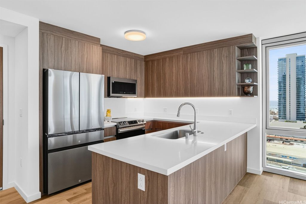 Spacious 2-bedroom, 2-bathroom, 2-parking corner unit, never lived in, located in a vibrant new community at the newly completed The Park on Keeaumoku - Liona Tower, with beautiful ocean, city, and mountain views, just minutes from Ala Moana's shopping, dining, and entertainment. This bright home features floor-to-ceiling windows, a private wraparound lanai, a modern kitchen with quartz countertops, and luxury vinyl plank flooring in the entire unit, newly installed motorized window shades for added privacy, and split A/C in every room for year-round comfort. Bidet Residents enjoy resort-style amenities including an infinity pool, spa, cabanas, a fully equipped fitness center with sauna, community gathering areas and clubrooms, and barbecue pavilions perfect for entertaining. The development also includes a commercial complex with upscale restaurants and food courts on the first and second floors. Due to the high volume of applicants, we will only contact those who have applied to schedule a tour once the unit becomes available. To Apply: Visit: https://hichoicerealty.managebuilding.com. Note: There is no application fee until we follow up with you.