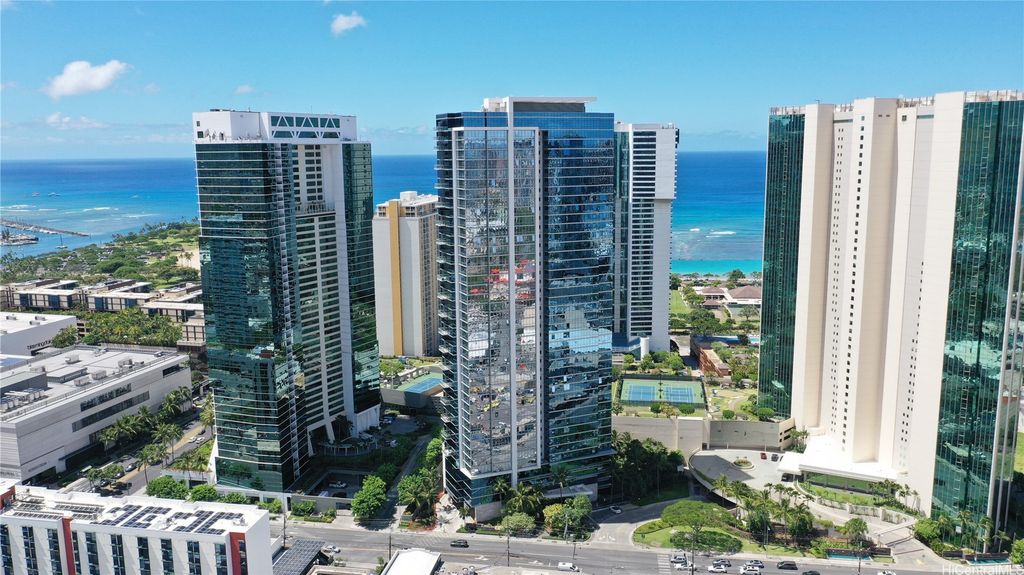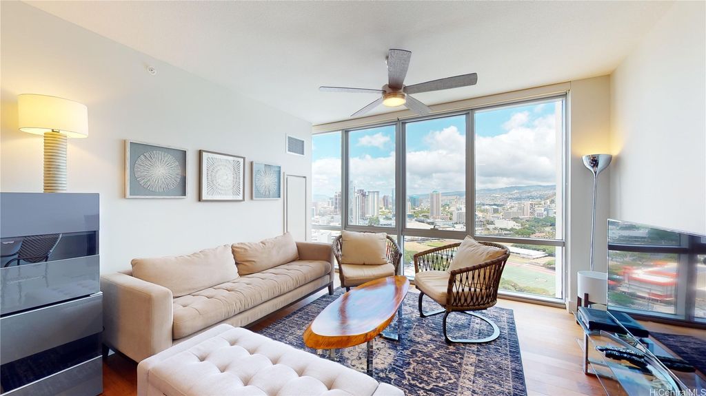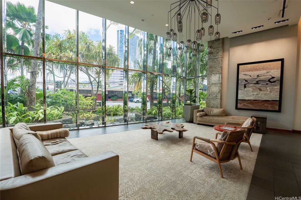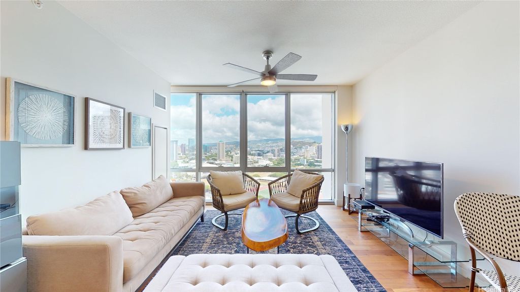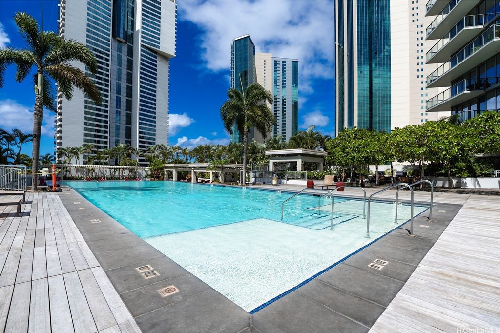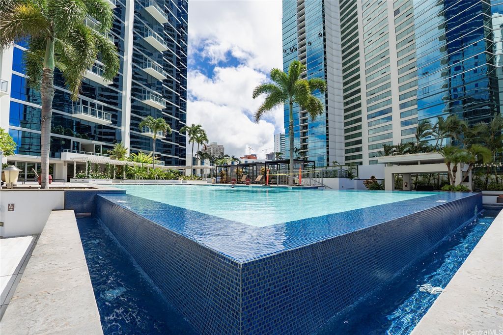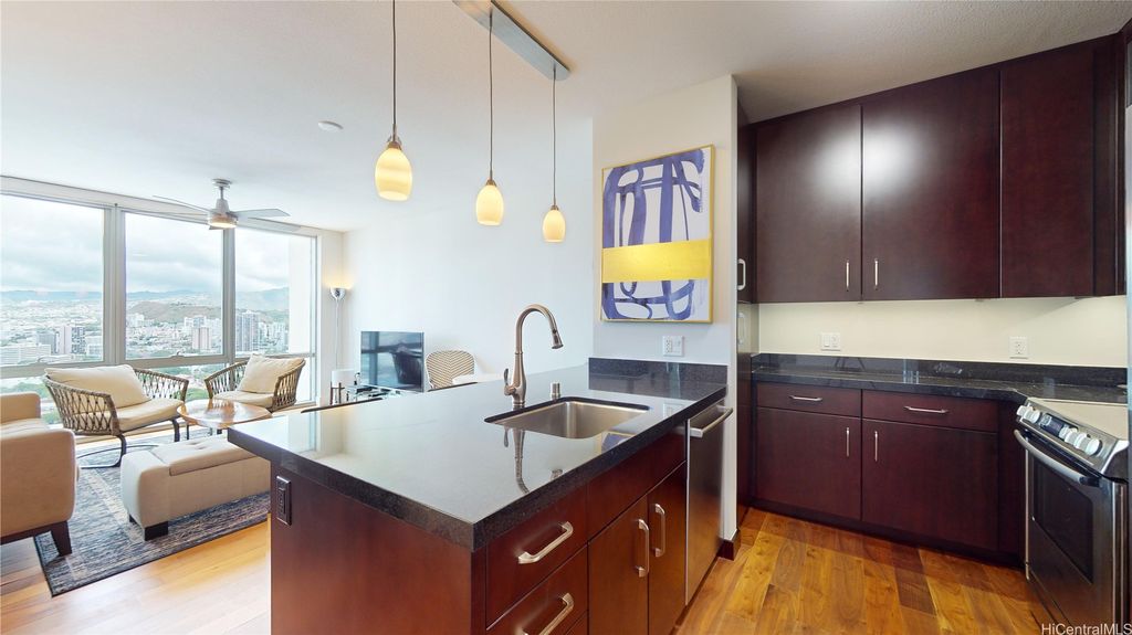 Welcome home to beautiful Waihonua! This fully furnished (except for a bed) 1 bdm, 1 bath contemporary condo offers city and mountain views in one of Honolulu's most desirable locations. The unit features a modern kitchen with custom cabinetry, granite countertops, and stainless steel appliances. Hardwood flooring runs throughout the entry, kitchen, and living room, while the bedroom is carpeted. Additional features include a central air conditioning and a full-size stacked washer and dryer. One parking stall and a private storage cabinet are included. Enjoy resort-style amenities such as an infinity-edge pool, whirlpool spa, poolside cabanas, BBQ area, private movie theater, and a state-of-the-art fitness center. Fob access to the building entry, elevators and parking. Conveniently located near Ala Moana Shopping Center, Ala Moana Beach Park, and a variety of restaurants and entertainment options, this home provides the perfect balance of luxury and lifestyle. Water, sewer, basic cable, and internet are included in the rent. No pets and no smoking allowed. Minimum 1-year lease, good credit, solid rental references, and renter's insurance required. $30 application fee per adult.