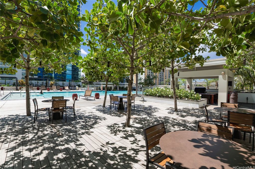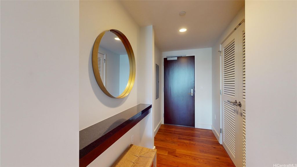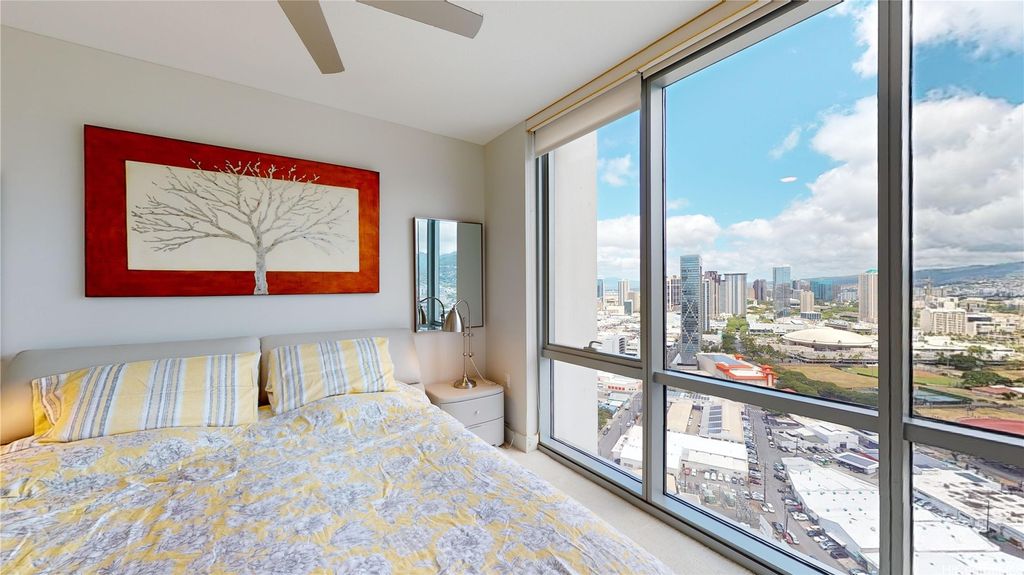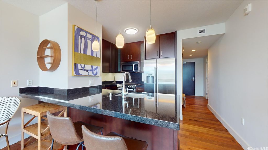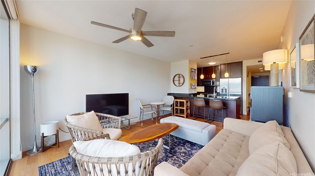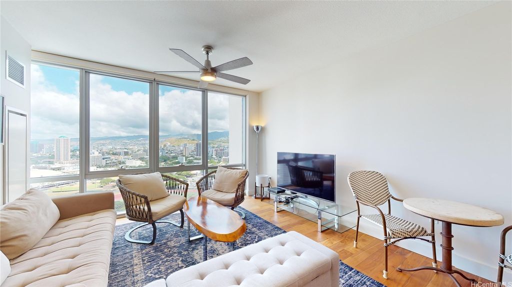 Welcome home to beautiful Waihonua! This fully furnished (except for a bed) 1 bdm, 1 bath contemporary condo offers city and mountain views in one of Honolulu's most desirable locations. The unit features a modern kitchen with custom cabinetry, granite countertops, and stainless steel appliances. Hardwood flooring runs throughout the entry, kitchen, and living room, while the bedroom is carpeted. Additional features include a central air conditioning and a full-size stacked washer and dryer. One parking stall and a private storage cabinet are included. Enjoy resort-style amenities such as an infinity-edge pool, whirlpool spa, poolside cabanas, BBQ area, private movie theater, and a state-of-the-art fitness center. Fob access to the building entry, elevators and parking. Conveniently located near Ala Moana Shopping Center, Ala Moana Beach Park, and a variety of restaurants and entertainment options, this home provides the perfect balance of luxury and lifestyle. Water, sewer, basic cable, and internet are included in the rent. No pets and no smoking allowed. Minimum 1-year lease, good credit, solid rental references, and renter's insurance required. $30 application fee per adult.