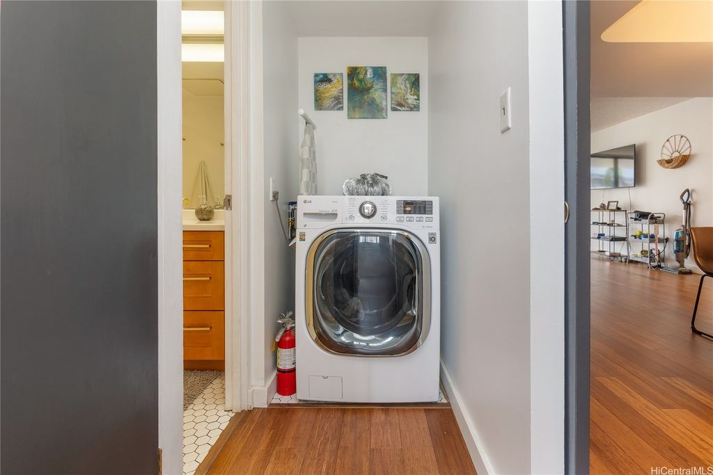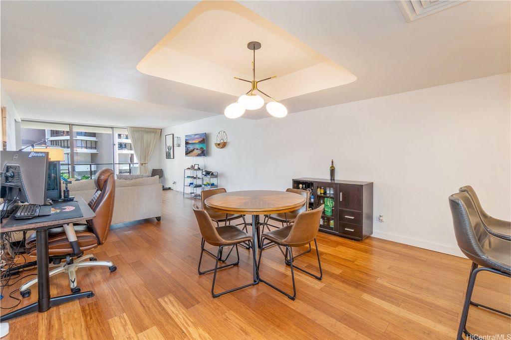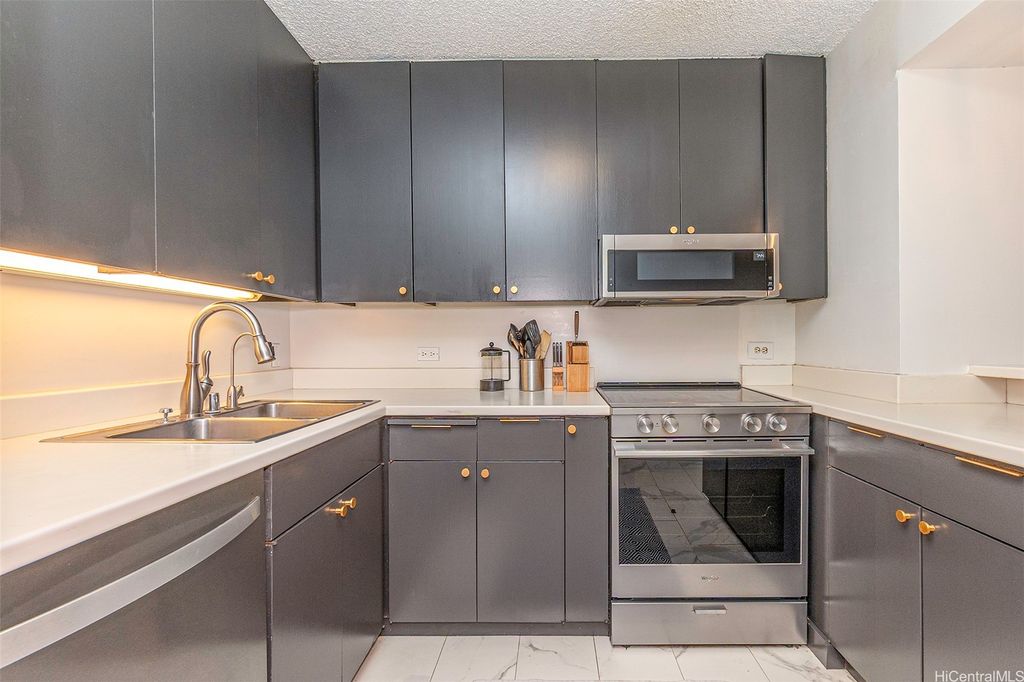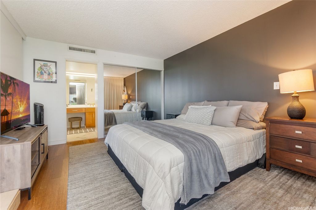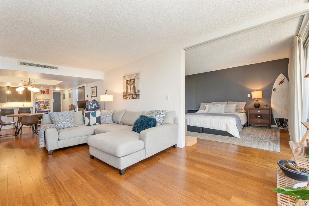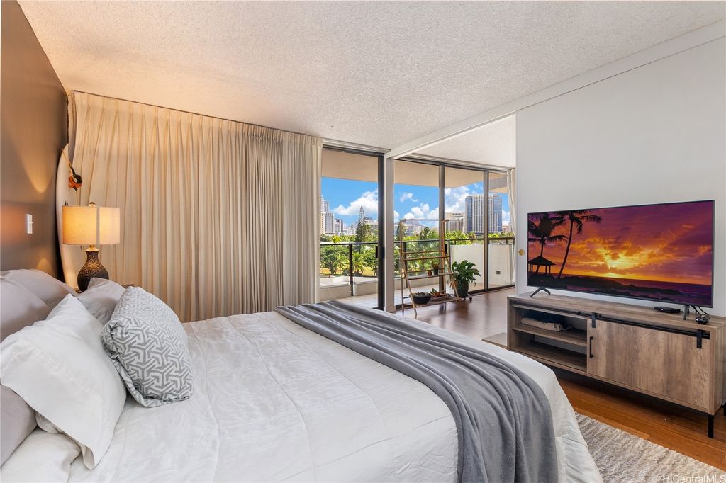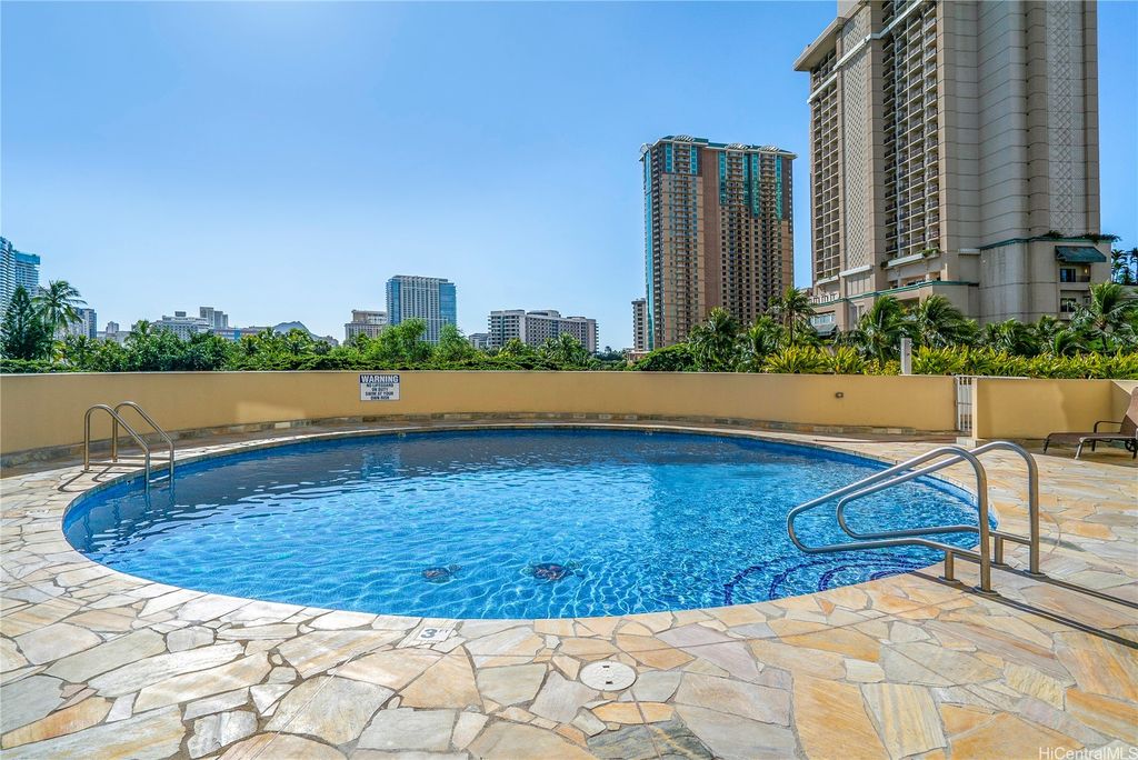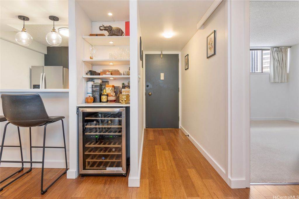Beautifully remodeled Wailana residence conveniently located at the gateway to Waikiki! This move-in ready, fee-simple unit features 2 bedrooms, 2 bathrooms, and 1 parking stall. Enjoy fresh air on the spacious lanai with Diamond Head and city views, perfect for relaxing or entertaining. The fully remodeled kitchen showcases upgraded stainless steel appliances, including a wine fridge, solid stone countertops, and opens seamlessly to the bright living area. Central AC unit was replaced in 2022. Elegant hardwood and marble tile flooring throughout add a sophisticated touch. Wailana at Waikiki is a pet-friendly building offering amenities such as a pool, recreation area, secured parking, and extra storage. Enjoy living just moments from world-class shopping, dining, and entertainment, Fort DeRussy Park, beautiful white-sand beaches, and the renowned Ala Moana Shopping Center.
