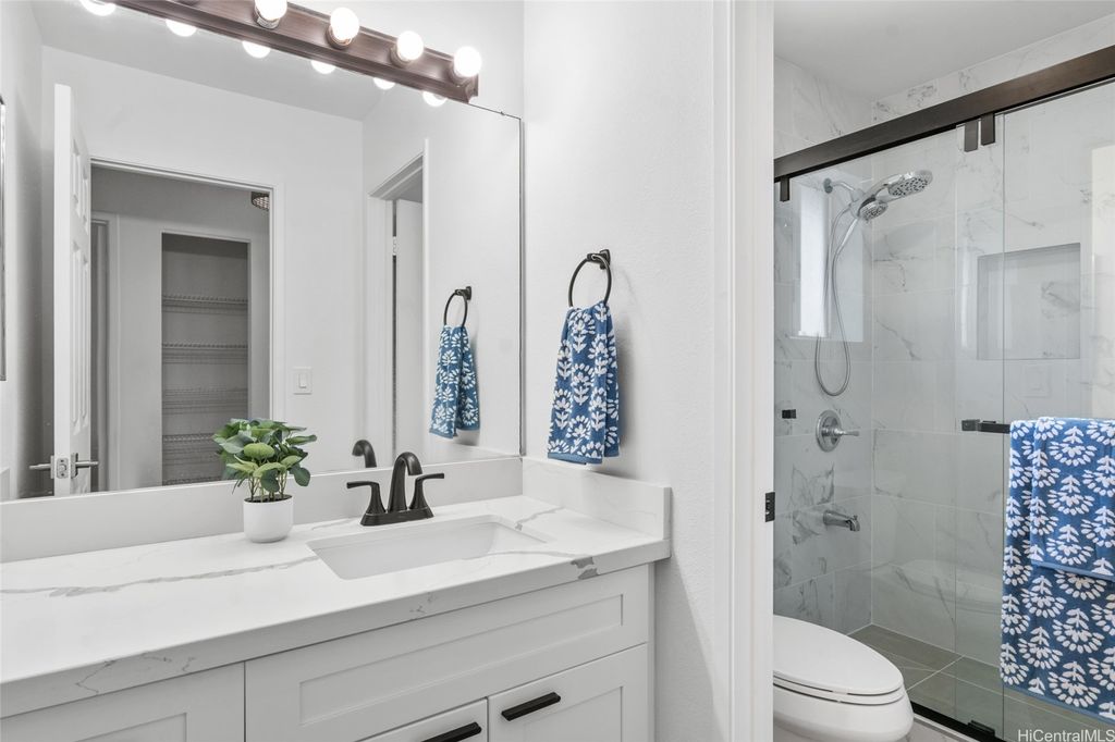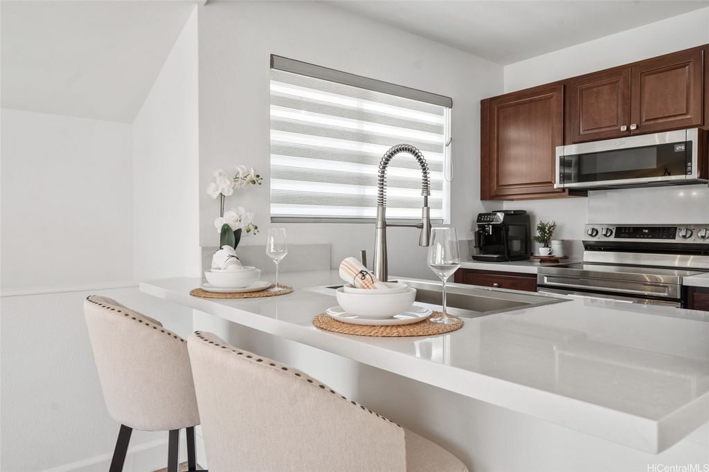 Welcome to this beautifully fully renovated single-family home in the desirable Ewa Gentry Alii Cove community! This 3- bedroom, 2-bath gem offers a spacious and versatile layout, with one bedroom and a full bath conveniently located on the ground floor, perfect for guests, extended family, or a home office. The home features new split AC units throughout, and stylish modern upgrades that make it truly move-in ready. Enjoy cooking in the updated kitchen, relaxing in the open living spaces, and retreating to your private backyard. Ideally located near parks, shopping, dining, and schools.