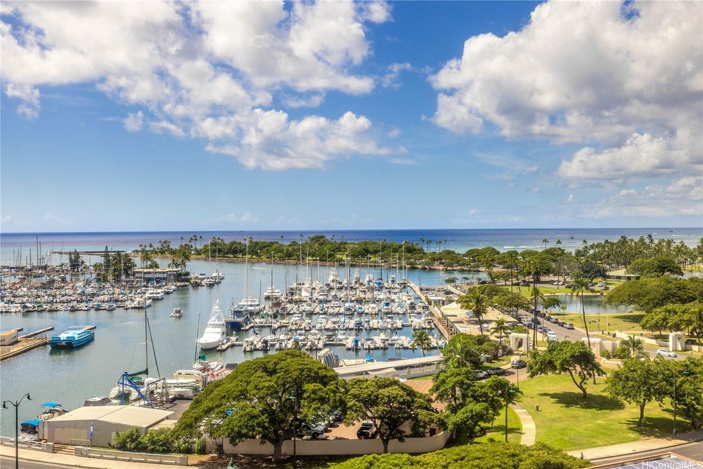 Welcome to your stunning 2-bedroom corner unit at Yacht Harbor Towers, offering breathtaking panoramic views of the ocean, Yacht Harbor, Magic Island, and Ala Moana. This beautiful home features central AC, an enclosed lanai, and a bright, windowed kitchen with gas cooking and new washer and dryer. The primary bedroom includes a spacious closet, and the unit is designed to maximize light and views throughout. Conveniently located just steps from Ala Moana Shopping Center, Yacht Harbor Towers provides resort-style amenities, including a heated pool, whirlpool, BBQ area, meeting room, tennis courts, guest parking, a resident manager, and 24-hour security. This is the island living at its finest, a perfect combination of comfort, convenience, and stunning views.