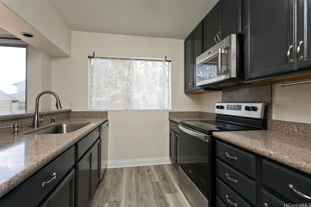 Assumable VA Loan at 2.25%! Spacious and breezy 3-bedroom, 1.5-bath townhome with two courtyards, new flooring and two parking stalls plus nearby street parking. Enjoy privacy, natural light, cool breezes, and beautiful sunset views in family-friendly Makakilo. The two private courtyards are fenced and perfect for relaxing or entertaining. Conveniently near the community pool, less than a mile from Mauka Lani Elementary, and close to shopping, dining, beaches, and the H-1 freeway. Townhome includes home-warranty for one year.