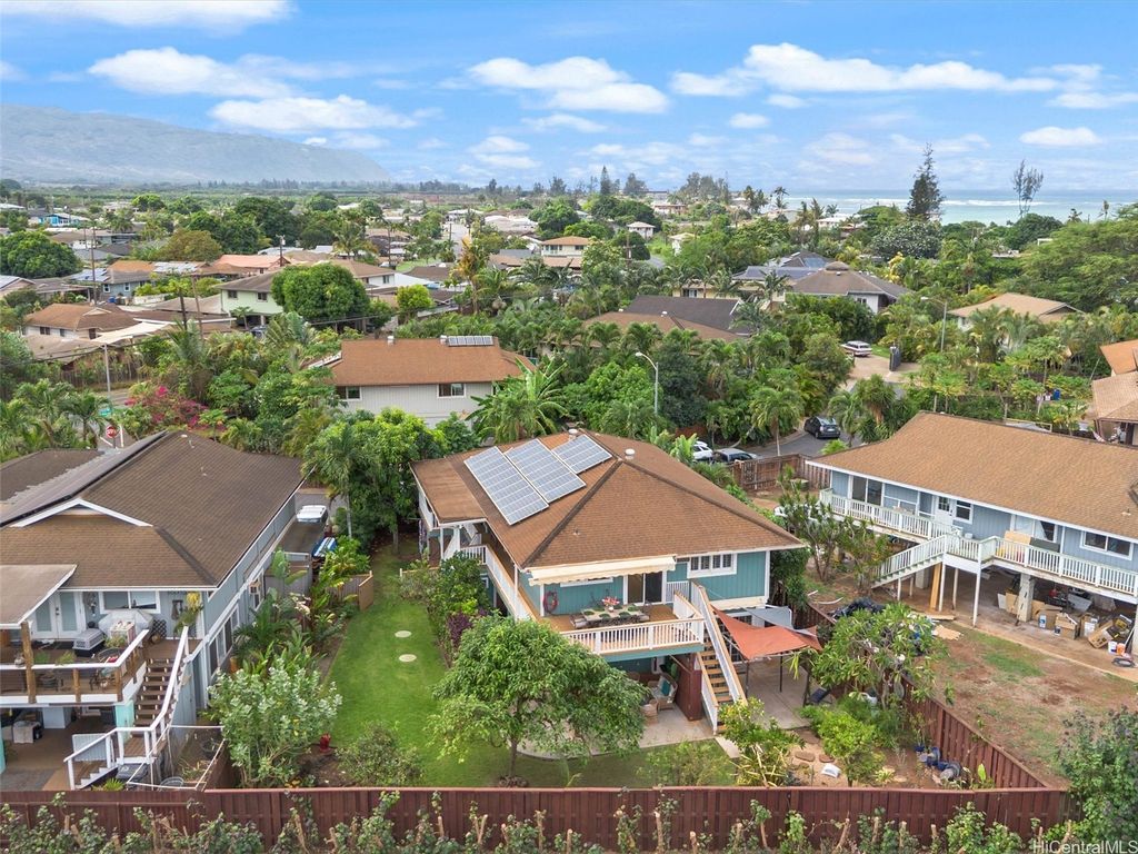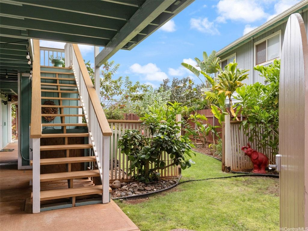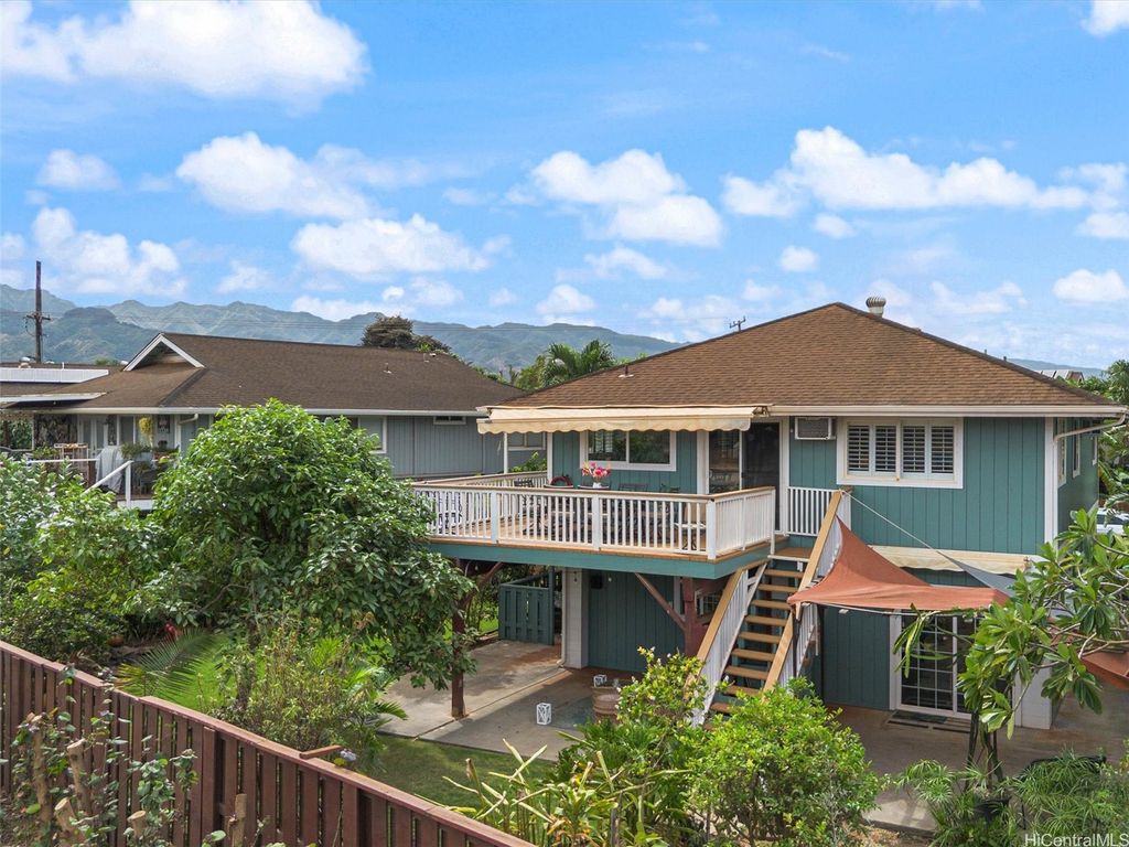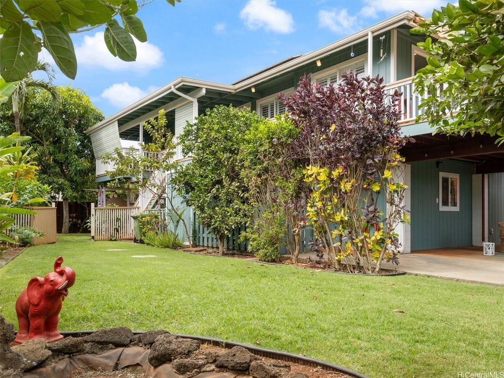 Situated in an upscale cul de sac near the beach, this home has been lovingly maintained by original owner. A few of the many features of this property include three bedrooms, two bathrooms upstairs, and 2 bedrooms, 1 bath downstairs with separate entrances. Separate laundry on each floor. Upgrades include 22 owned solar panels, septic already installed, cedar sauna,landscaped yard with sprinkler system. The large lot has Mango, avacado, citrus and plumaria trees. Huge lanai off kitchen/dining room has a peek a boo view of the ocean and lovely mountain views. Outside shower for convenience when returning from the nearby beach and large storage/workshop which could also be used as a carport.
