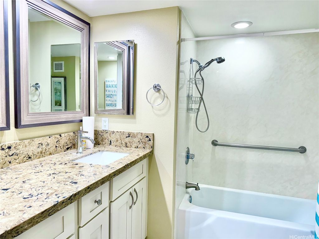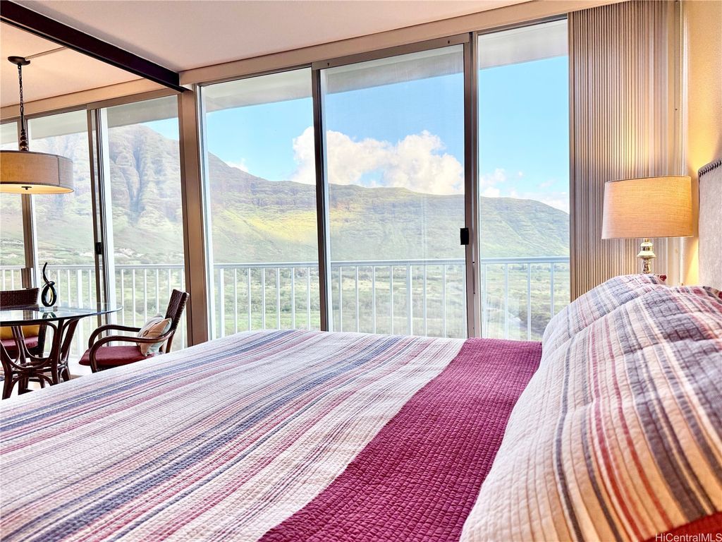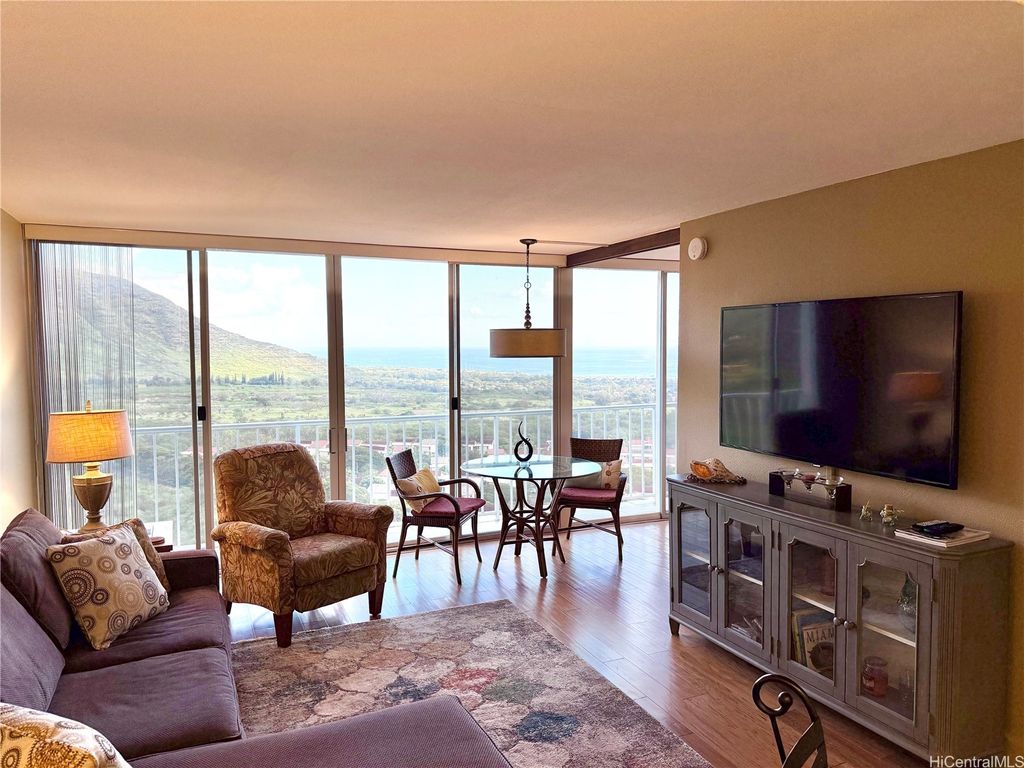 Located in the highly desired mauka side, this exquisite, fully remodeled condo offers the perfect blend of modern luxury and comfort. Step inside to find a chef-inspired kitchen and spa-like bath featuring spacious shaker-style cabinetry, sleek quartz countertops, and a stylish staggered-pattern tile floor. The open living area and bedroom are bathed in natural light, accented by warm hardwood flooring and custom lighting that creates an inviting atmosphere throughout. The bathroom showcases a beautifully customized shower enclosure with cultured marble, and the dressing area is illuminated by elegant canned lighting. A custom shoji door in the bedroom adds a unique touch of tranquility and style. The original popcorn ceiling has been removed, enhancing the condo's clean, contemporary aesthetic. Being sold fully furnished, complete with everything shown in the photos. Move-in ready and waiting for you to enjoy all the luxury and convenience it has to offer!