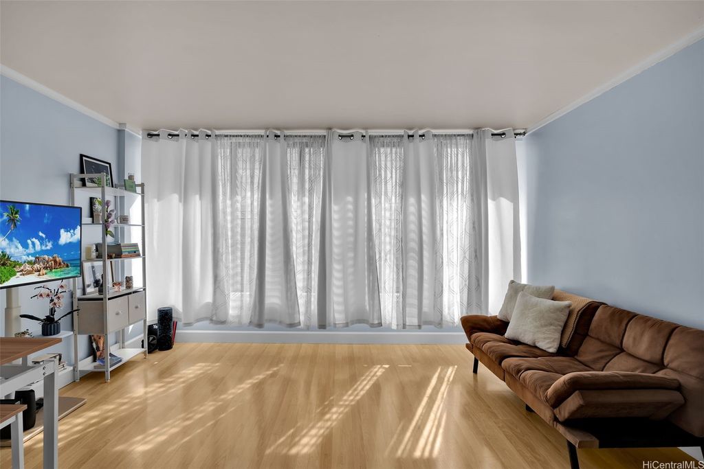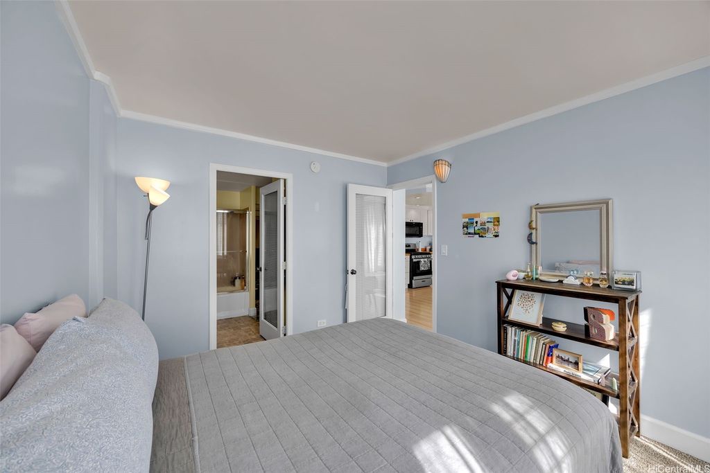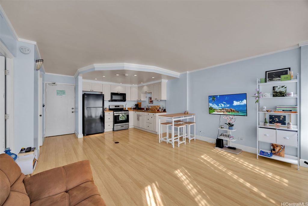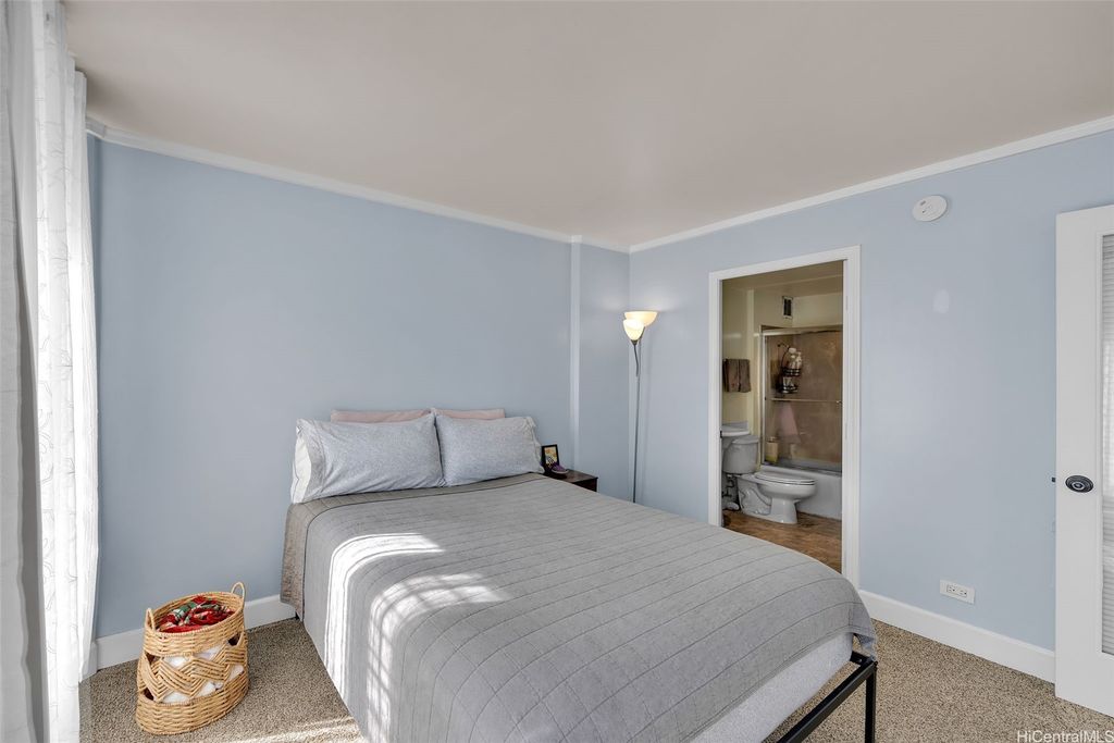 Enjoy beautiful ocean and Haleakala views from this renovated one-bedroom condo at Puuone Terrace. This airy, light-filled home features an open floor plan with laminate flooring throughout. The kitchen offers white cabinetry, black appliances, a stainless-steel sink, and butcher block countertops, complemented by recessed lighting and crown molding. A gas oven/range makes meal preparation a pleasure. The bedroom and living room both capture the soothing ocean and mountain vistas. The spacious bathroom, accessible from both rooms, includes dual mirrored closet areas, a tub/shower combination, and a pedestal sink. Covered parking is conveniently located next to the elevator. Ideally situated near Wailuku's shopping, dining, and entertainment options, this condo offers comfort and convenience in a prime location.