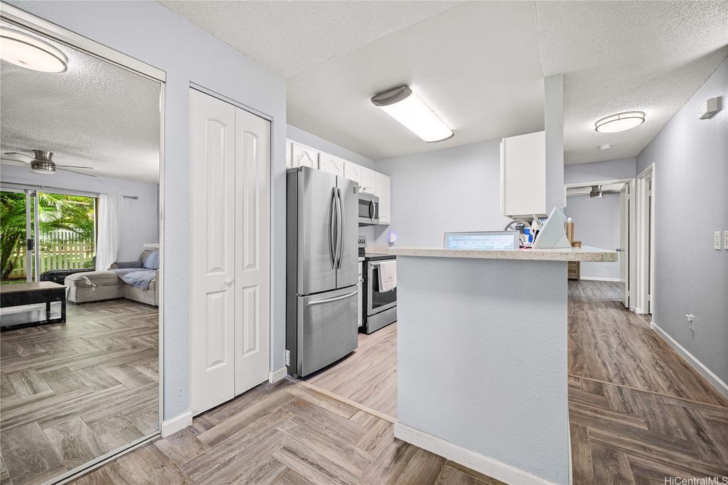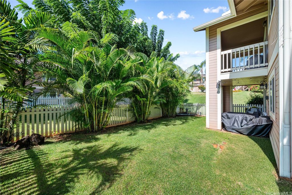 Welcome Home to this beautifully maintained ground floor corner 2 bedroom, 1 ½ bath, 1 parking end residence in the highly desired Mahi Ko at Waikele community! Spacious, fully fenced private yard"”lush and lovingly maintained"”extends directly from the living room, creating your own tropical sanctuary. The covered lanai is perfect for relaxing, dining outdoors, or enjoying the cool breezes unique to this corner-end orientation. Located in Central O"˜ahu, Mahi Ko at Waikele offers unbeatable convenience. You're just minutes from freeway access, military bases, Waikele Country Club, the popular Waikele Premium Outlets, grocery stores, dining options, parks, and more. This home comes with one assigned parking stall and multiple guest stalls nearby. This is a gem in paradise!
