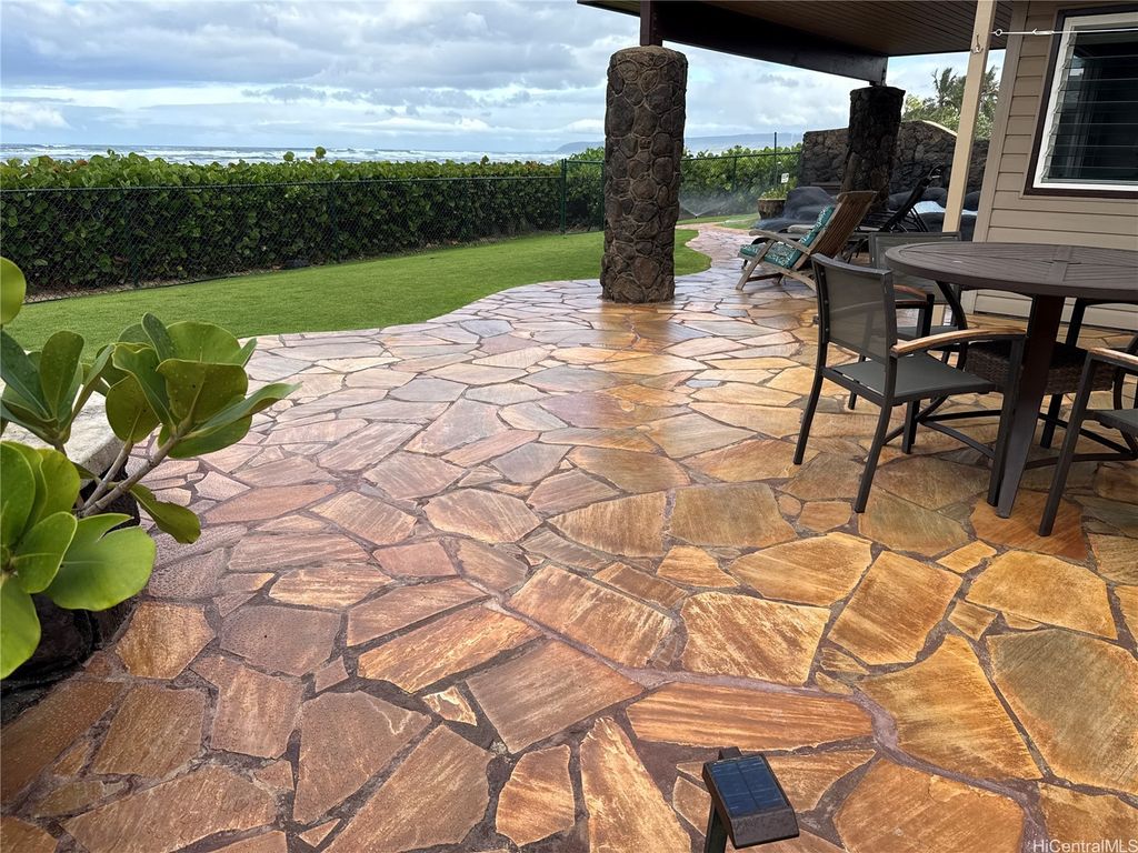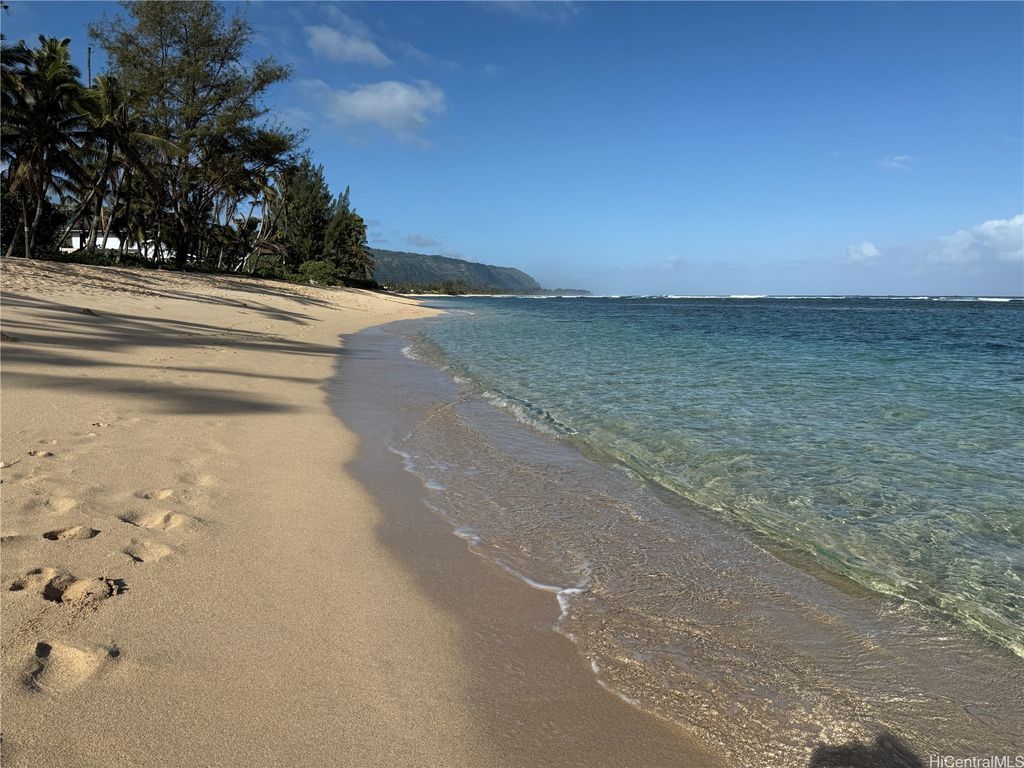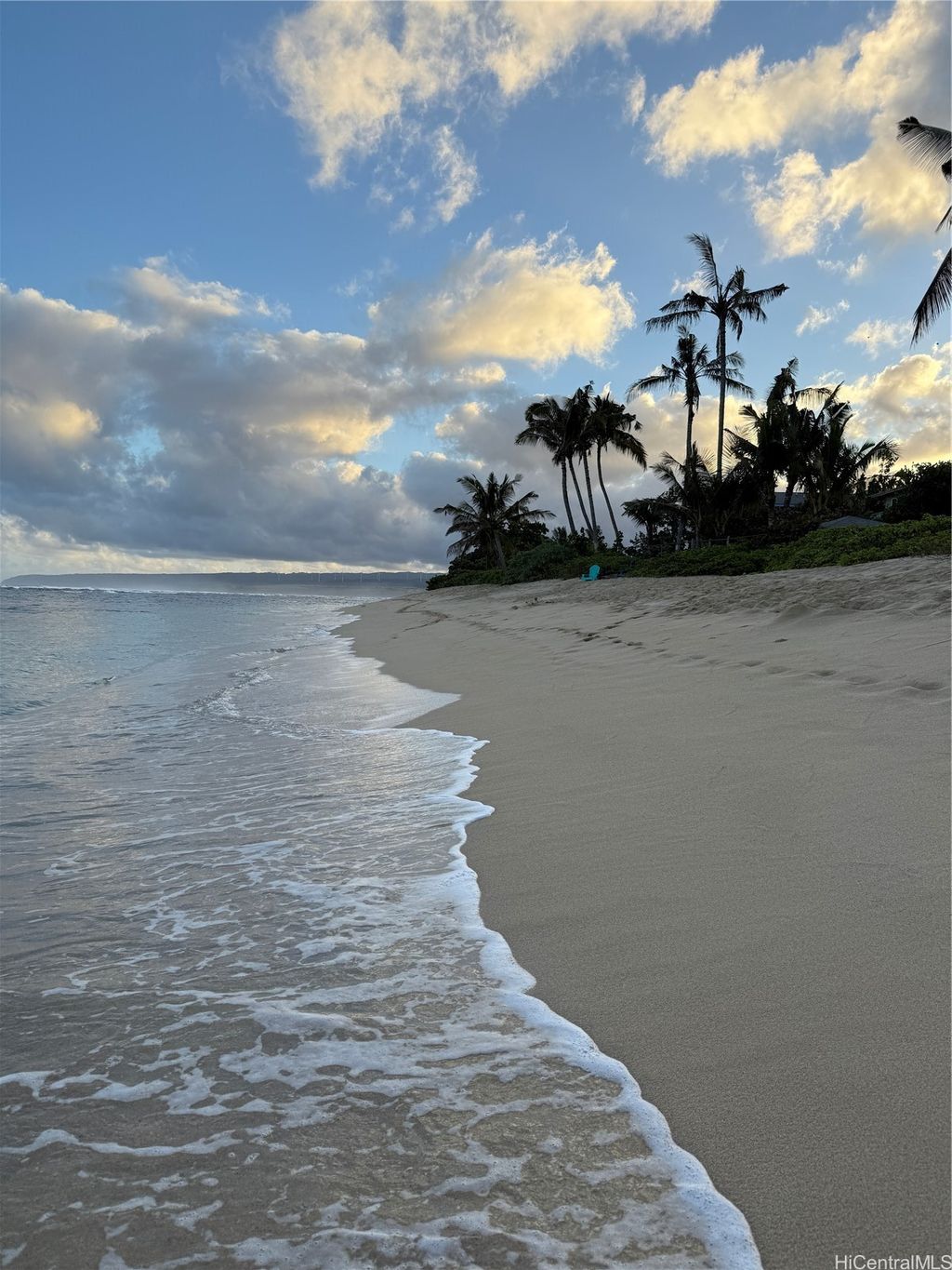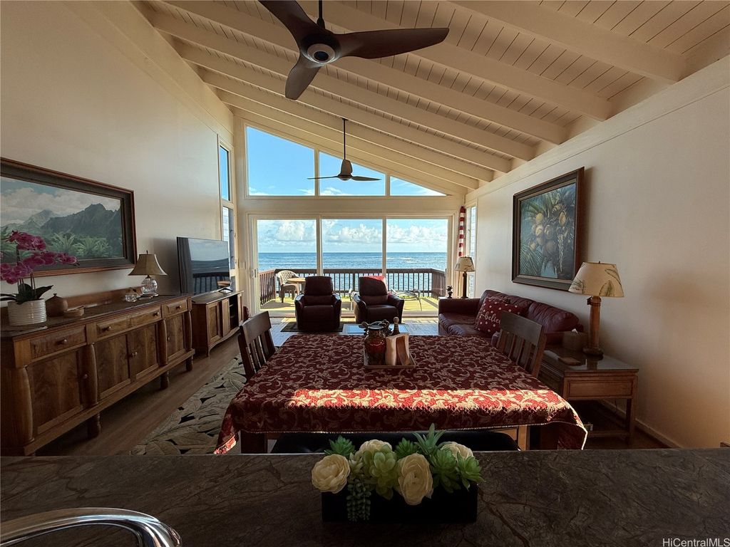 A rare beachfront opportunity in Waialua this exceptional estate offers over 66 feet of ocean frontage along a beautiful white-sandy beach. Enjoy the best of North Shore living with stunning ocean views, turtles and seasonal whale watching right from your backyard. This gated estate features tiled, salinated, lava rock, solar-heated, swimming pool, surrounded by lush tropical landscaping and expansive quartzite patios. This residence has been beautifully remodeled with African mahogany finishes, travertine, cherry cabinetry, Sub-Zero and Wolf appliances, and custom copper/aluminum roofing. Designed for flexibility and comfort, the home offers multiple living configurations ideal for multigenerational living or investment (duplex style 3/2 up and 1/1 down). Highlights include four spacious bedrooms, three custom bathrooms, a home office/guest suite with a separate entry and panoramic ocean views through custom coastal windows and sliding glass doors. Modern amenities include 24 owned PV panels with net metering, monitored security, and an on-demand gas water system. Experience the serenity and privacy of Waialua's beachfront lifestyle- swim, surf, or relax to the sound of the waves.