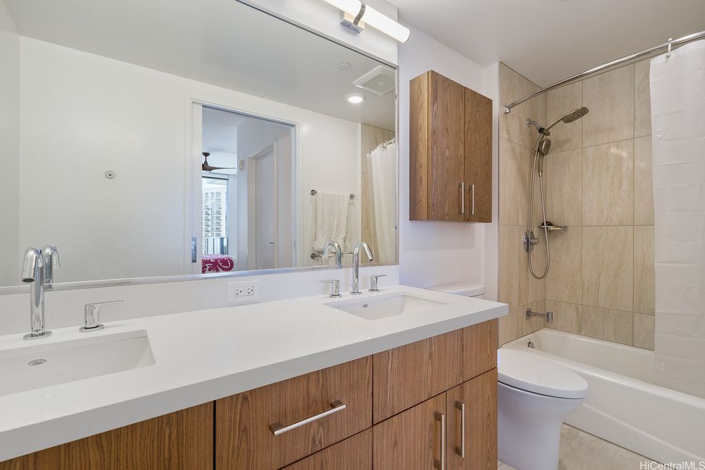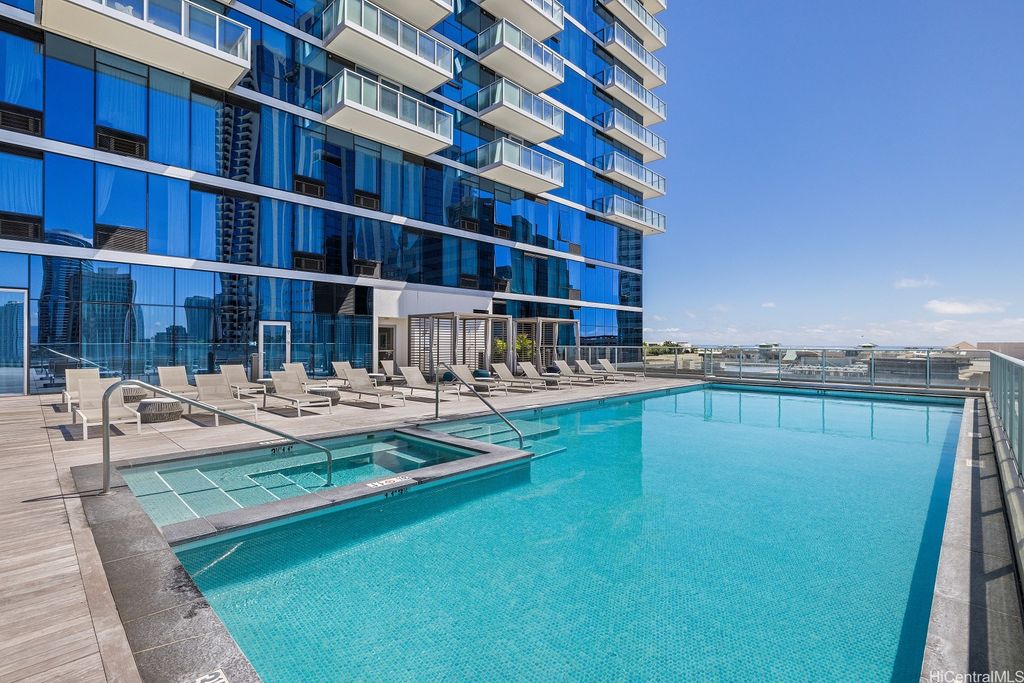 Enjoy luxury convenient living on the 35th floor in Mid town Honolulu. Built in 2021,the unit is in Excellent Condition with 9 foot high ceilings with ceiling fans in the bedrooms and living room. Enjoy the ocean and mountain views from the living room, lanai and both bedrooms.  Azure offers an exercise room, recreation room, movie theater, 4 grills and 2 cabanas, puppy park, 4 guest rooms for out of town visitors, and concierge services. The unit has two parking stalls and storage. Across the street from Ala Moana Center, Walmart, Sam's Club, great restaurants and much more. Very close to Magic Island and Ala Moana beach. Azure is fully covered with 100% hurricane nsurance.