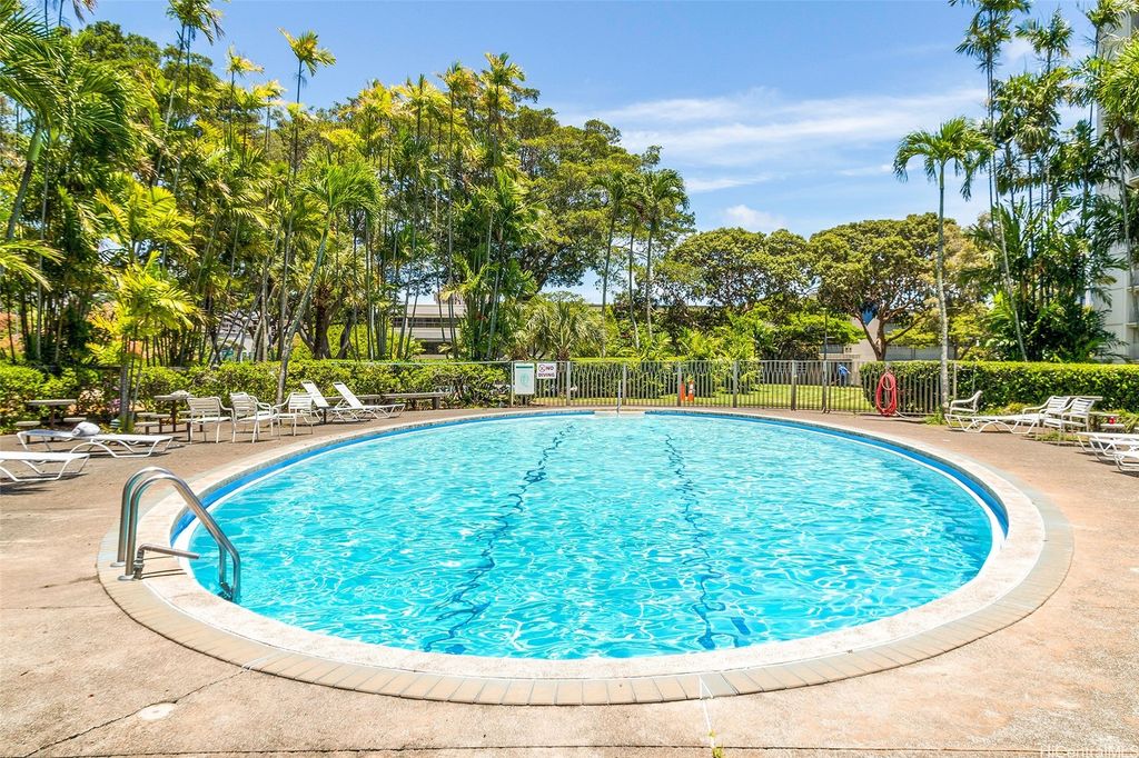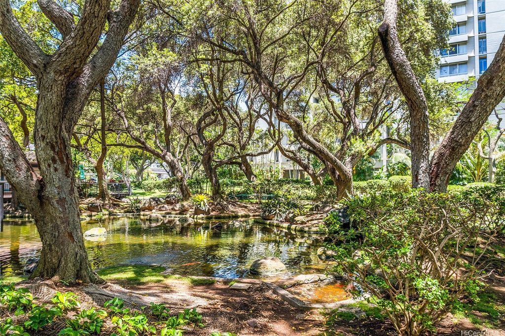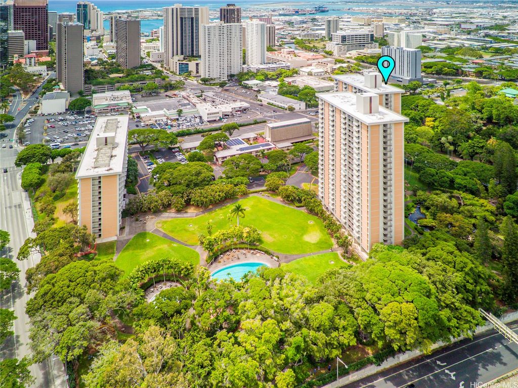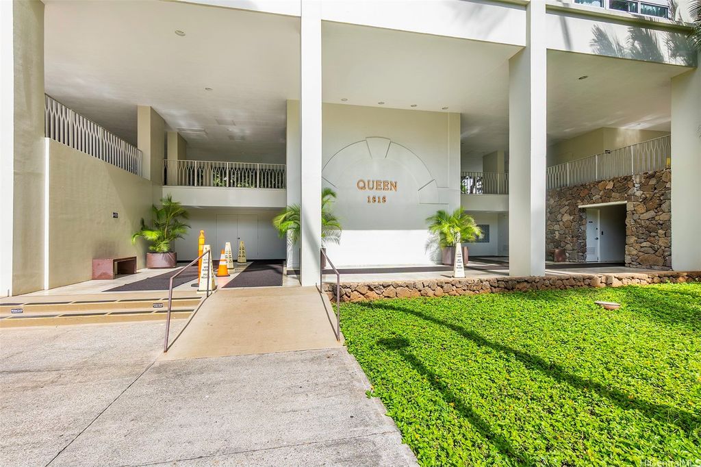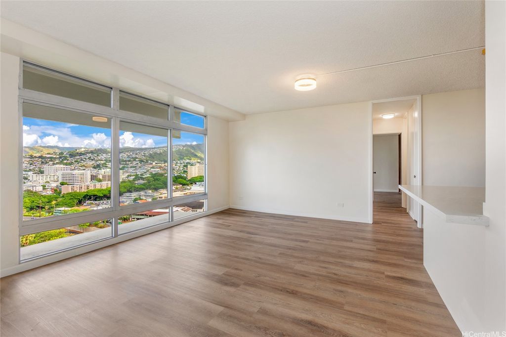 Don't miss this rarely available corner end unit in the Queen Tower at Queen Emma Gardens. This spacious 2 bedroom, 1 bathroom home with 1 covered parking stall has been beautifully renovated with a modern kitchen featuring stainless steel appliances, quartz countertops, new cabinets, and a stylish backsplash. Laminate wood flooring flows throughout the unit, adding a clean and contemporary feel. Adding to its unique appeal, this was historically the one-of-a-kind unit where the original developer and resident manager resided, featuring ornate double doors that set it apart. Take in the beautiful 20th floor city and mountain views overlooking Foster Botanical Gardens. Queen Emma Gardens is a pet-friendly community offering wonderful amenities, including Japanese-style tea-houses, swimming and wading pools, a tranquil koi pond, BBQ area, and picnic sites, all in a convenient location near downtown Honolulu, shopping, and dining. Put this on your must-see list! One or more photos have been enhanced.
