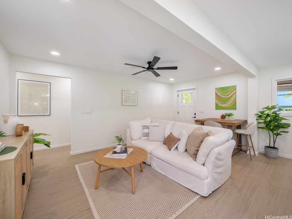 Wake up to the rhythm of the North Shore in this freshly renovated Haleiwa hale. Thoughtfully redesigned from top to bottom, this single-level 4BD/2BA home blends soft natural tones, warm wood finishes, and open living spaces that invite connection and calm. The kitchen, with its sleek island, quartz counters, and warm wood cabinetry, anchors the home for everyday life and weekend gatherings alike. Spacious bedrooms offer serene views of tropical greenery, while the primary suite features a stylish en-suite bath with walk-in shower. Step outside to enjoy gentle trade winds, a private yard framed by palms, and space to relax after a surf session or day in town. With a 2-car carport, large driveway, and easy access to Haleiwa's beaches, cafes, and local markets, this home feels like modern island living done right.