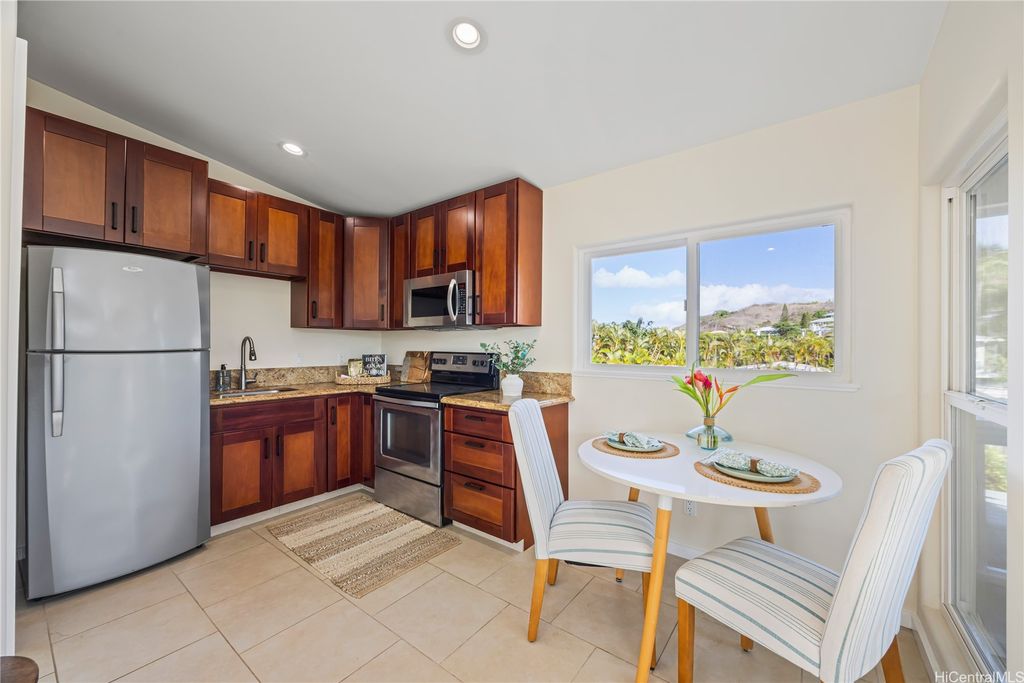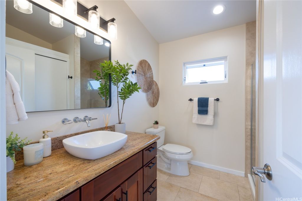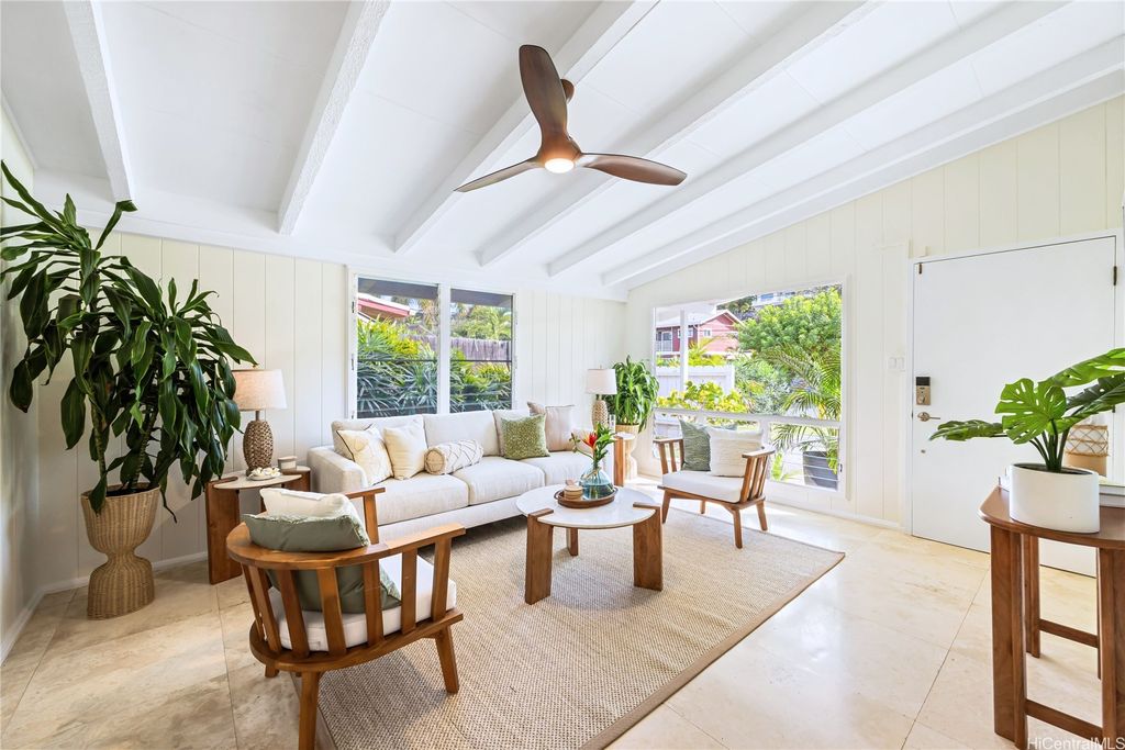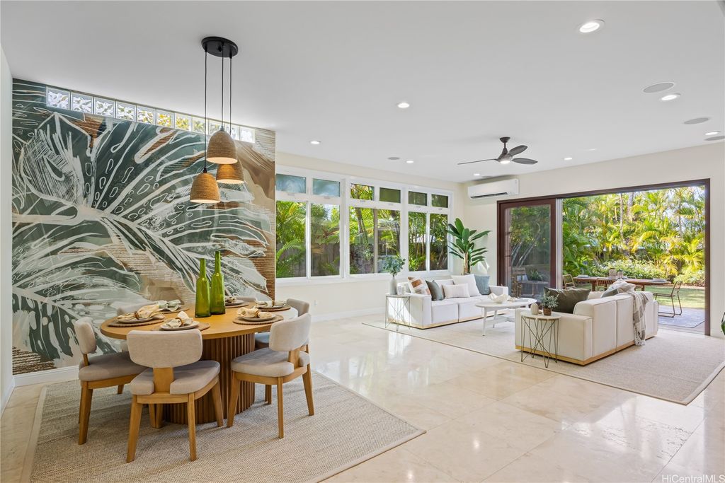 Coveted Country Club Knolls, just 8 houses from Kailua Beach Park. This beautifully updated home offers unmatched flexibility, modern upgrades, and an incredible beachside lifestyle. The main level features 4 bedrooms, 3 bathrooms, two generous living areas, and a refreshed chef's-dream kitchen overlooking a spacious dining and living area. Oversized stacking doors open to a lush backyard, perfect for parties, play, or quiet relaxation. Designer touches, fresh paint, updated lighting, new flooring, and a bright, breezy layout create a peaceful, modern feel throughout. Vaulted ceilings, split ACs, & owned PV with Net Metering add long-term comfort and savings. Upstairs, a fully updated 1-bd/bth/liv/kitchenette w/ its own private entrance provides exceptional flexibility for multigenerational living, guests, or rental income. Live the ultimate Kailua lifestyle: stroll to Kailua Beach Park, Lanikai, Buzz's, and Kalapawai, or launch your boat at the nearby ramp. With Ka"˜ohao Charter School moments away and Mid-Pac Country Club a quick golf cart ride from home, this rare home blends comfort, location, and coastal living in one of Kailua's most sought-after neighborhoods.
