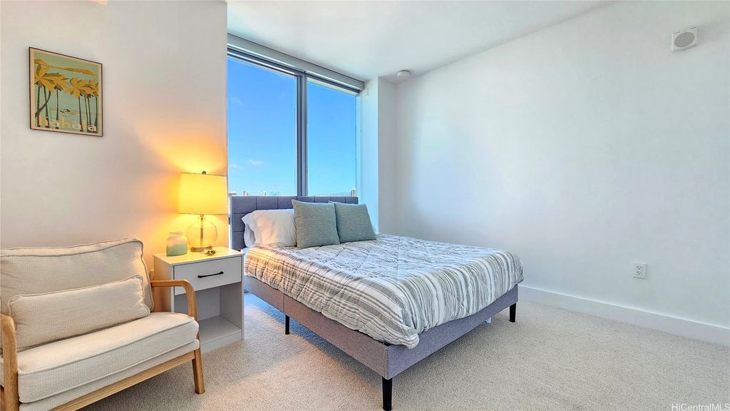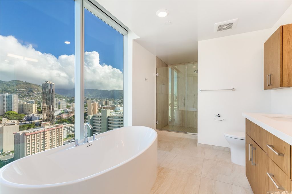 Azure Ala Moana is a rare, one-of-a-kind offering -a true corner-unit 2-bed / 2-bath with three sides of expansive glass delivering sweeping mountain, city/west-sunset, & direct ocean views toward Magic Island. Open kitchen is equipped with top-tier appliances and tasteful finishes that complement the bright, open living spaces. The unit features a ductless split air-conditioning system with a concealed indoor blower unit for efficient, quiet cooling without visible wall units. Two assigned parking stalls provide added convenience for this highly desirable residence. Located in a secured building, residents enjoy an attractive amenity package including guest suites, movie theater room, large party room, pool, hot tub, BBQ cabanas, dog park, and fitness center. The building also offers friendly security staff and a beautifully appointed lobby to welcome guests. Centrally located in midtown Ala Moana, this home offers immediate access to the best of Honolulu: shopping, restaurants, hospitals, schools and more are all just minutes away. Whether you're seeking an elegant primary residence or a refined island retreat, Unit 2312 blends spectacular panoramic views w/ everyday convenience.