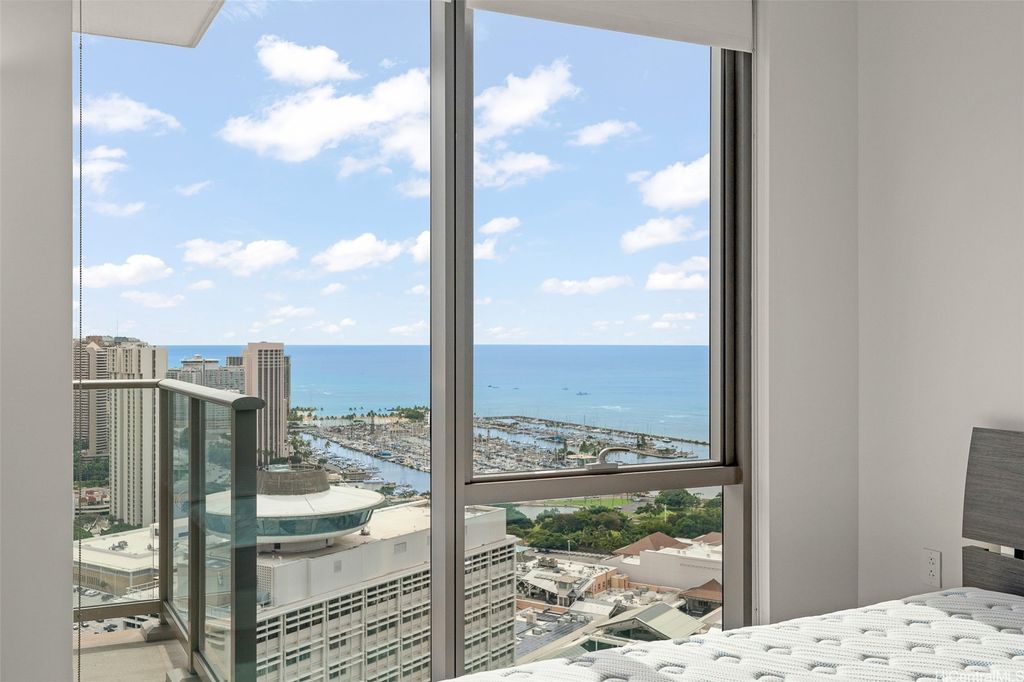 FURNISHED! ONE SMALL PET ALLOWED! Enjoy gorgeous ocean views and the Friday night fireworks from your lanai and bedroom! Discover unparalleled convenience in this beautiful 1-bdrm, 1-bath 556 sq. ft fully furnished condo at Sky Ala Moana. This unit offers a modern, efficient layout and comes complete with 1 assigned parking stall and a small storage unit. Enjoy resort-style living with access to the building's amenity deck, featuring a pool, spa, fitness center and various lounges. Situated directly across from the famed Ala Moana Center, known globally as a premier shopping destination, you have access to world-class dining, retail, and entertainment. No smoking, Renters insurance required prior to move in and throughout occupancy. Non-refundable application fee of $25 per person 18 years or older.